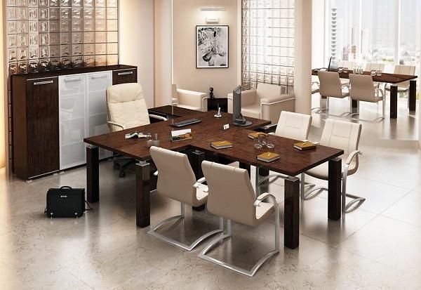 Систему хранения представляют тумбы и шкафы. Качественное исполнение элементов повышает их износостойкость, а значит они долгое время будут служить вашему делу. В модельный ряд также включены переговорный стол, журнальный стол и гардероб. Набор, который поможет создать благоприятные условия для работы и встречи деловых партнёров.