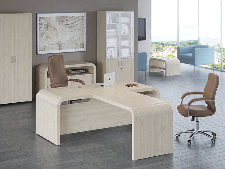Широкий выбор элементов позволяет организовать рабочее место так, чтобы в нем было уютно и комфортно во время сложных переговоров или во время небольшого перерыва. Вы можете укомплектовать письменный стол брифинг-приставкой. Переговорную зону можно организовать с помощью отдельных элементов. В серию также включены шкафы, гардеробы и тумбы с центральным замком.