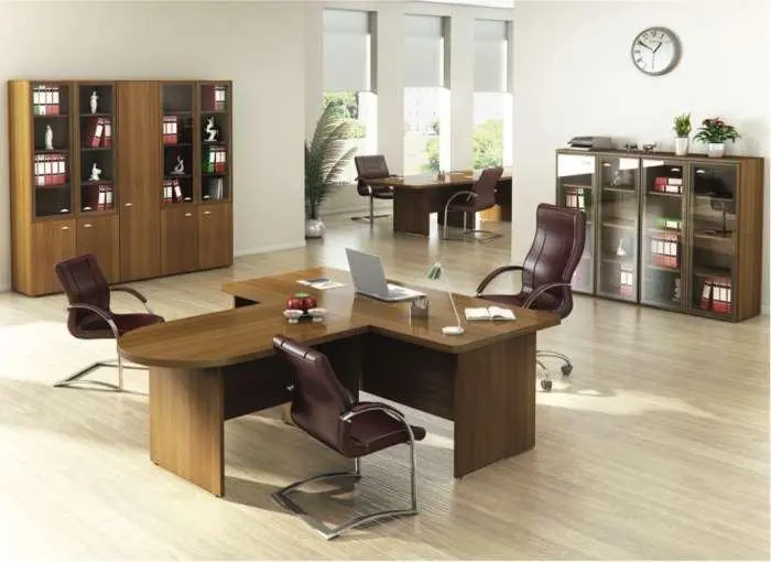 Офисная мебель выполнена в эргономичном, классическом стиле на европейский лад. Классическая мебель в сочетании с гибкими линиями рабочих столов придает общей обстановке кабинета особую изысканность.