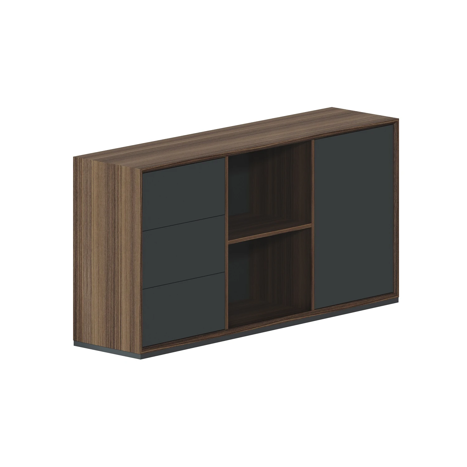 Греденция разделяется на 3 секции. Левая секция с глухой дверью. Правая - 3 выдвижных ящика. Центральная секция открытая.