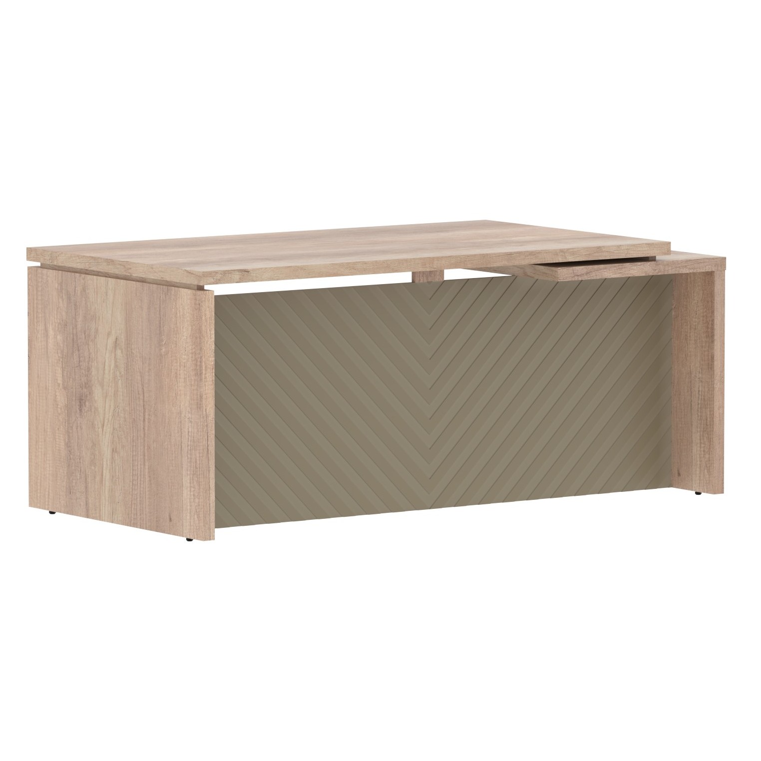 Столешница и опоры из ЛДСП толщиной 38мм с кромкой ПВХ т.2мм в цвет ЛДСП. Стол комплектуется регулируемыми опорами. Фронтальная панель из одностороннего МДФ т.19мм фрезерованного крашенного матовой эмалью, высотой до пола h=640мм.