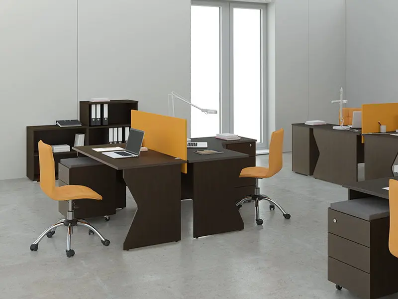 Столешницы приставных элементов изготовлены из 22 мм ДСП с двухсторонним меламиновым покрытием с кромкой 2 мм ABS и устанавливаются на металлические хромированные опоры. Топы приставных тумб изготовлены из 22 мм ДСП с двухсторонним меламиновым покрытием с кромкой 2 мм ABS. Каркасы приставных тумб выполнены из 16 мм ДСП с кромкой 1 мм ABS. Столешница журнального стола и стола для переговоров выполнена из 22 мм ДСП с двухсторонним меламиновым покрытием с декоративной кромкой 2 мм ABS, опоры изготовлены из 16 мм ДСП.
