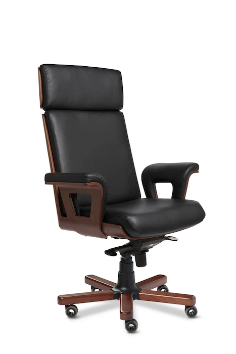 Кресло руководителя Cadis A - новая и эксклюзивная модель из натуральной кожи премиум класса, выполняется с высокой спинкой и удобным подголовником. Спинка и сидение уложены в фанерованный ковш, облицованный пластиком. Пластик - имитация текстуры ценных пород древесины. Дизайн кресла лаконичен, сочетает в себе строгость и элегантность. Кресло оборудовано механизмом качания с регулировкой под вес и фиксацией в четырёх положениях ("Мультиблок"), а так же регулировкой высоты за счет установленного в крестовине кресла газо-масляного амортизатора (газпатрона) 3-ей категории стабильности (DIN 4550 class 3), категория повышенной надёжности: газпатрон выдерживает нагрузку в 200 тысяч циклов при динамической стендовой нагрузке в 80 кг. Максимальное давление, при котором срабатывает газпатрон - около 150 кг. Толщина поролона на сиденье и на спинке 80 мм. Применяемая марка поролона 30/40 (плотность/жесткость) обеспечивает долговечность кресла. Каркас кресла выполнен из высокопрочной гнутоклееной фанеры. Чехол кресла выполнен из черной или цветной мебельной, натуральной кожи сквозного крашения со среднезернистым тиснением из цельных шкур крупного рогатого скота, задняя часть спинки по евростандарту из кожзама (компаньона) в цвет кожи. Толщина шкуры в стандартной точке 0,9-1,1мм. Также чехол может быть выполнен из экокожи ("Орегон") или микровелюра. Для придания объемности и правильной эргономики чехла кресла - применяется холофайбер ( марка 400). Спинка и сидение гладкие, не имеют строчек или утяжек. Все указанные материалы экологичные и износостойкие - высшего качества. Подлокотники кресла изготовлены из гнутоклееной фанеры, с внешней стороны облицованы пластиком. Пластик - имитация текстуры ценных пород древесины. С внутренней стороны и сверху укомплектованы мягкой накладкой-подушкой, обтянутой натуральной кожей в цвет чехла кресла. Крестовина металлическая сварная из профильной трубы 25*25*1,5 мм выдерживает нагрузку до 150 кг, лучи крестовины закрыты декоративными накладками из массива бука, тонированных и покрытых шелковисто матовым полиуретановым лаком (производство Италия) в несколько слоев. Ролики - паркетные прорезиненные (обеспечивают сохранность паркета, ламината). Каждый ролик рассчитан на нагрузку в 30 кг.