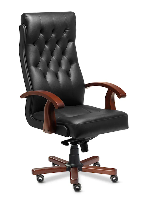 Кресло руководителя Darwin А - престижная, отлично зарекомендовавшая себя в эксплуатации модель категории Бизнес-класса. Выполняется с высокой спинкой, деревянными подлокотниками и деревянными накладками на крестовине, может быть выполнена в комплектации хром. Дизайн кресла сочетает в себе эргономичность и функциональность. Кресло оборудовано механизмом качания с регулировкой под вес и фиксацией в четырёх положениях - "Мультиблок" (может быть укомплектовано и другими механизмами такими как - "Топган" и Топган-Люкс"), а так же регулировкой высоты за счет установленного в крестовине кресла газо-масляного амортизатора (газпатрона) 3-ей категории стабильности (DIN 4550 class 3), категория повышенной надёжности: газпатрон выдерживает нагрузку в 200 тысяч циклов при динамической стендовой нагрузке в 80 кг. Минимальное давление, при котором срабатывает газпатрон - 21,5 кг, максимальное - около 150 кг. Каркас кресла смонтирован из фанеры берёзы и бруса сосны с проклейкой узлов сопряжения. Каркас имеет эргономичный изгиб спинки . Толщина поролона сиденья и спинки 110 мм. Применяемая марка поролона 30/40 (плотность/жесткость) обеспечивает долговечность кресла. Боковые стороны каркаса имеют декоративные обитые накладки. Чехол кресла выполнен из черной или цветной мебельной, натуральной кожи сквозного крашения со среднезернистым тиснением из цельных шкур крупного рогатого скота, задняя часть спинки по евростандарту из кожзама (компаньона) в цвет кожи. Толщина шкуры в стандартной точке 0,9-1,1мм. Для придания объемности и правильной эргономики чехла кресла - применяется холофайбер ( марка 400). Чехол спинки кресла имеет утяжки по всей поверхности в средней части, образуя рисунок в виде восьми ромбов. Сидение - одну поперечную и две продольные прострочки, образуя рисунок в виде прямоугольника. Все указанные материалы экологичные и износостойкие. Подлокотники кресла изготовлены из массива бука, тонированы и покрыты шелковисто-матовым полиуретановым лаком (производство Италия) в несколько слоев. Крестовина металлическая сварная из профильной трубы 25*25*1,5 мм выдерживает нагрузку до 150 кг, лучи крестовины закрыты декоративными накладками из массива бука, тонированных и покрытых шелковисто матовым полиуретановым лаком (производство Италия) в несколько слоев. Ролики - паркетные прорезиненные (обеспечивают сохранность паркета, ламината). Каждый ролик рассчитан на нагрузку в 30 кг.