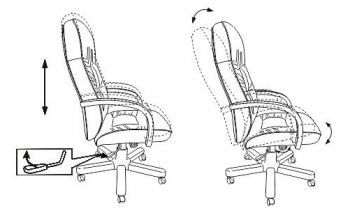 Механизм качания с регулировкой под вес и фиксацией в вертикальном положении. Регулировка высоты (газлифт). Подлокотники деревянные. Крестовина металлическая с деревянными накладками. Материал обивки: кожа. Нагрузка до 120 кг