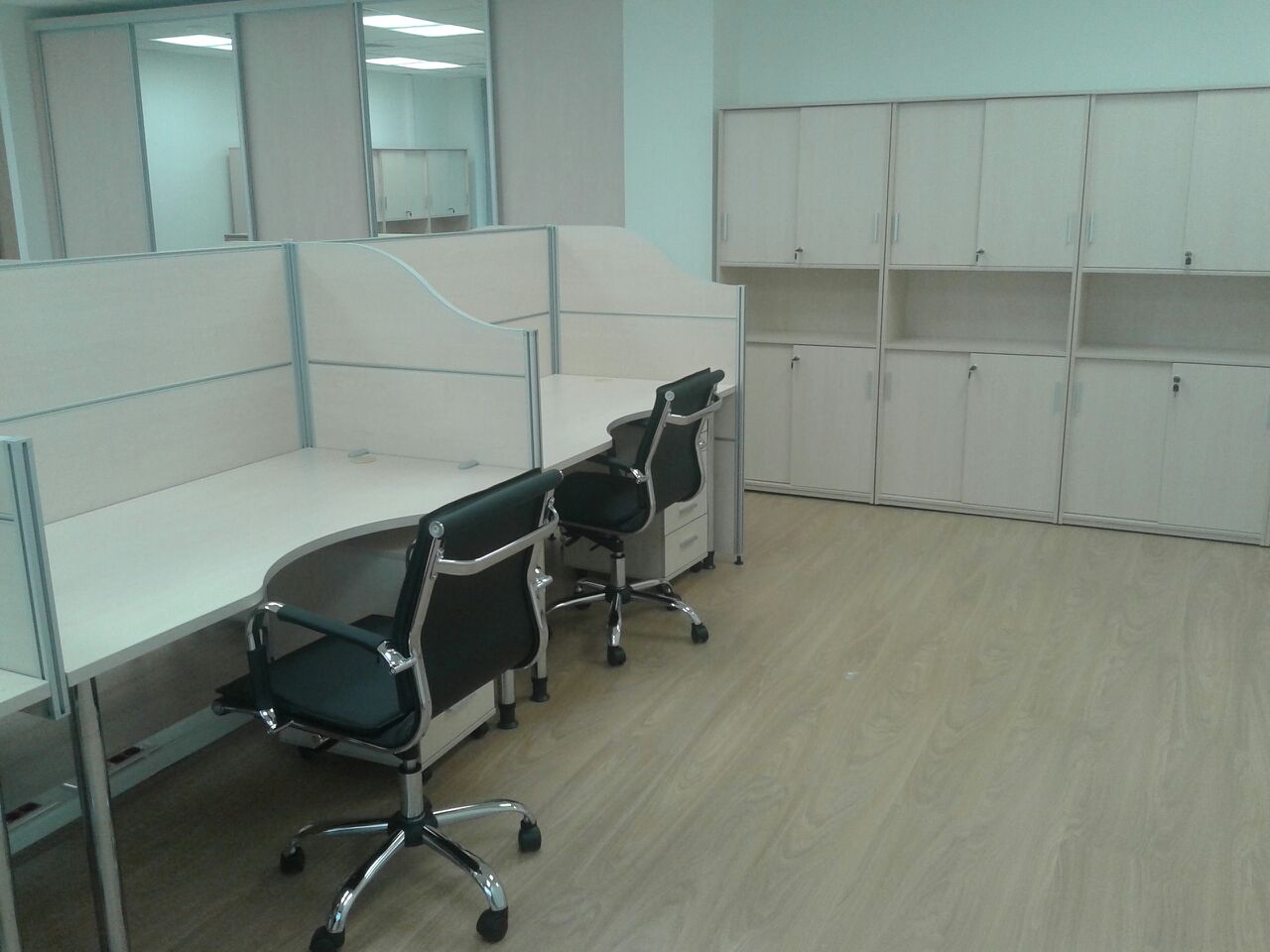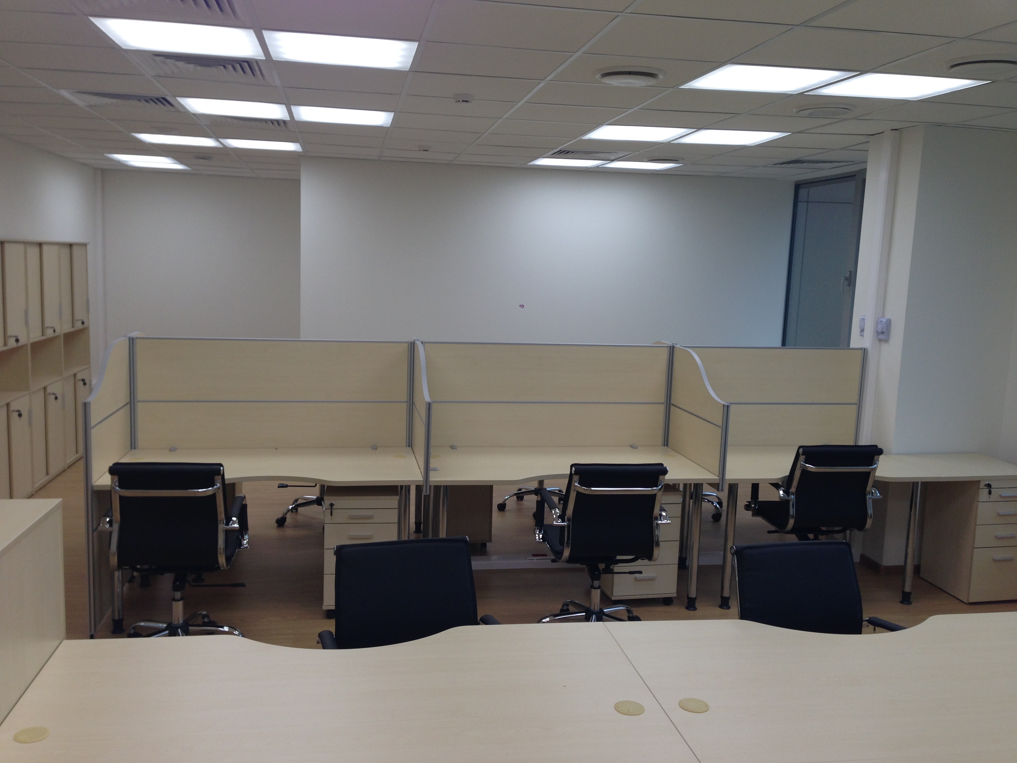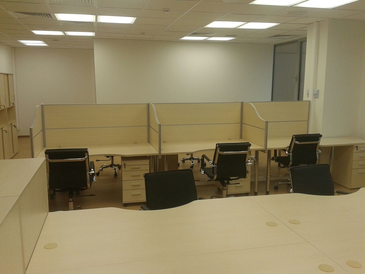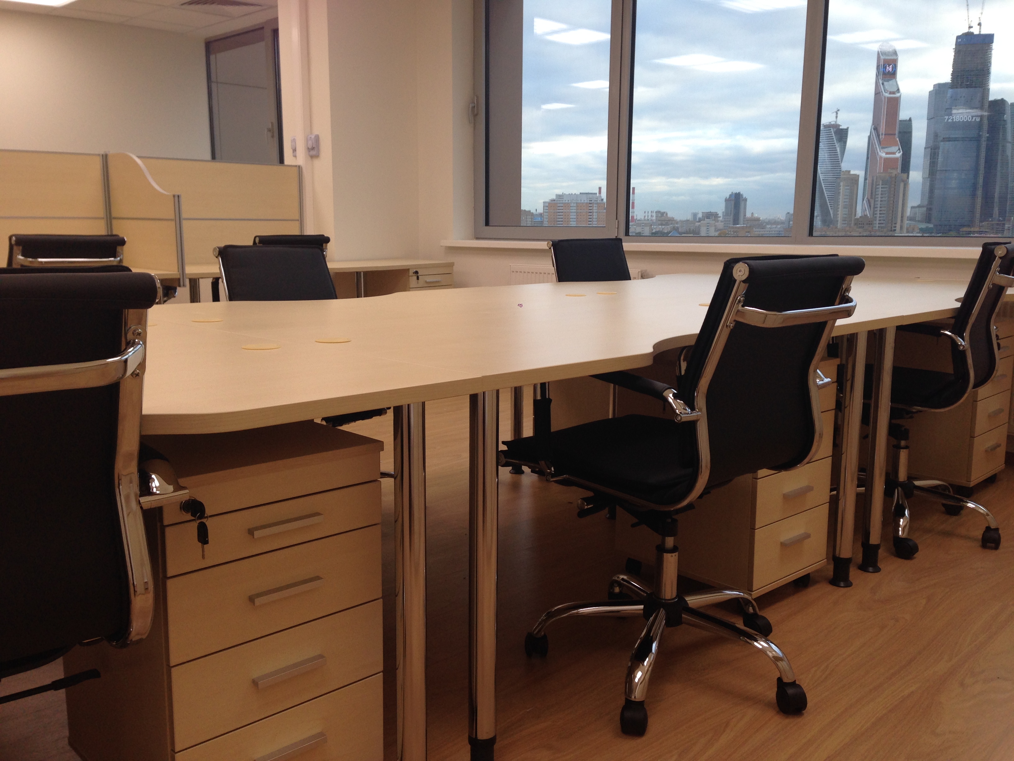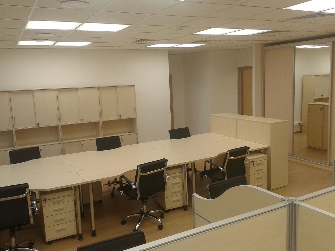 50 рабочих мест серия Periscop Orgspase. Цвет клен, опоры хром,шкафы купе для одежды,кабинет Flash выбеленный дуб.