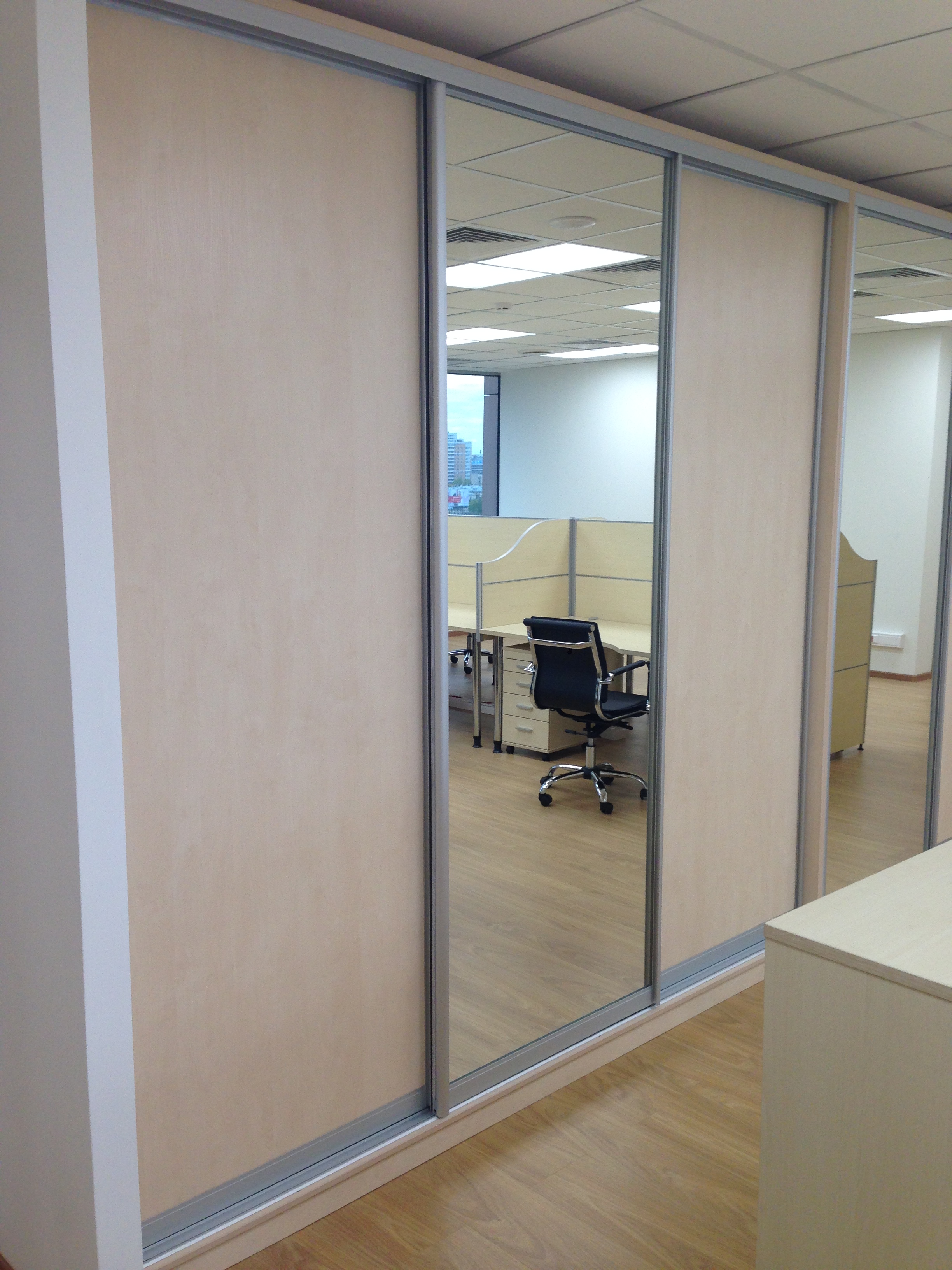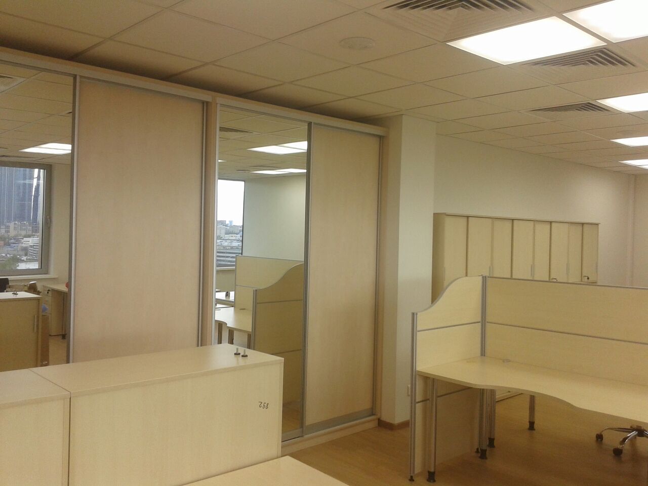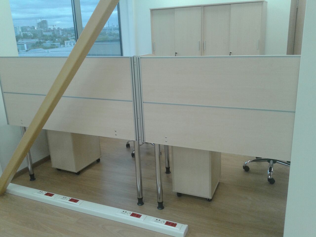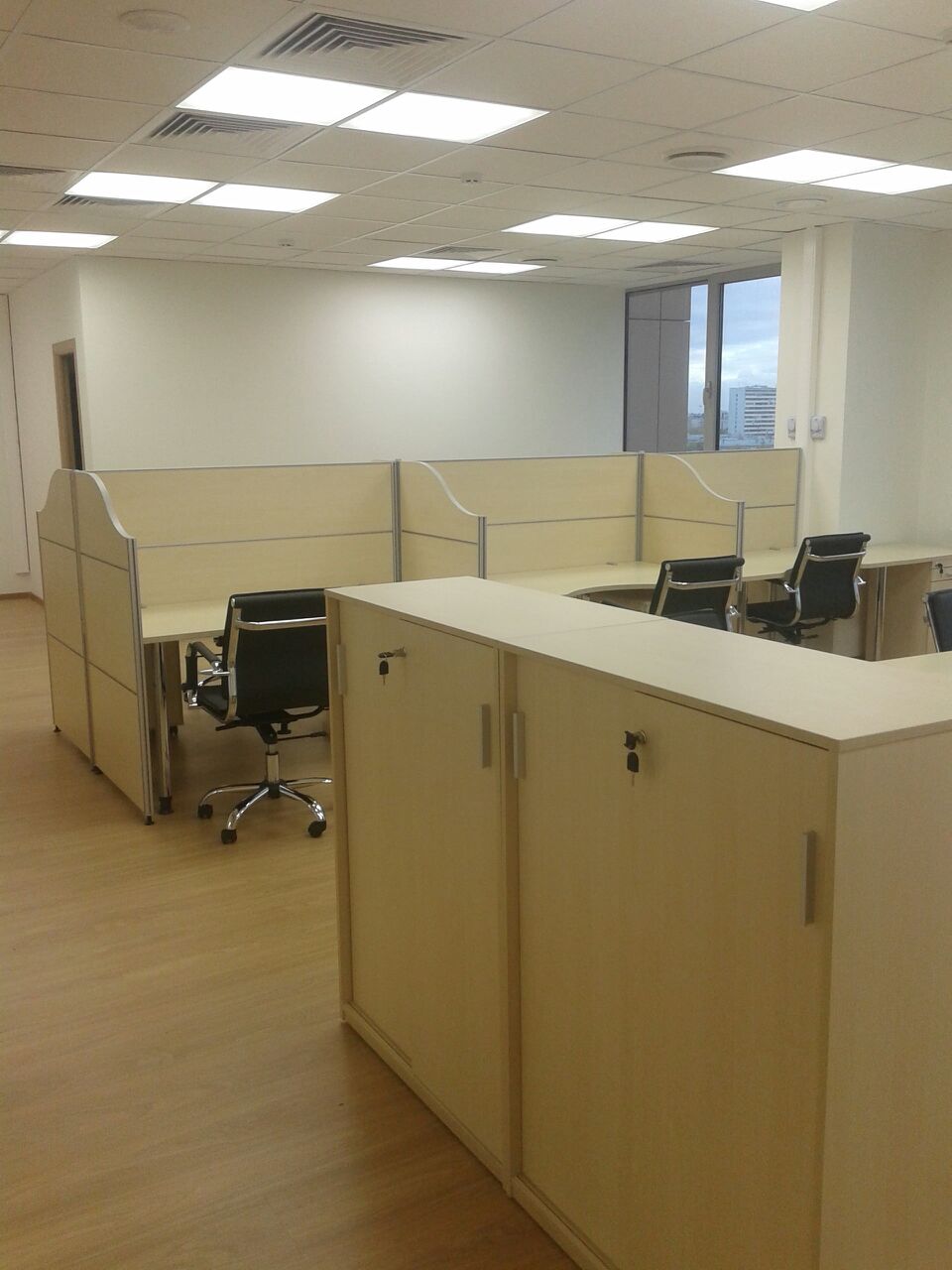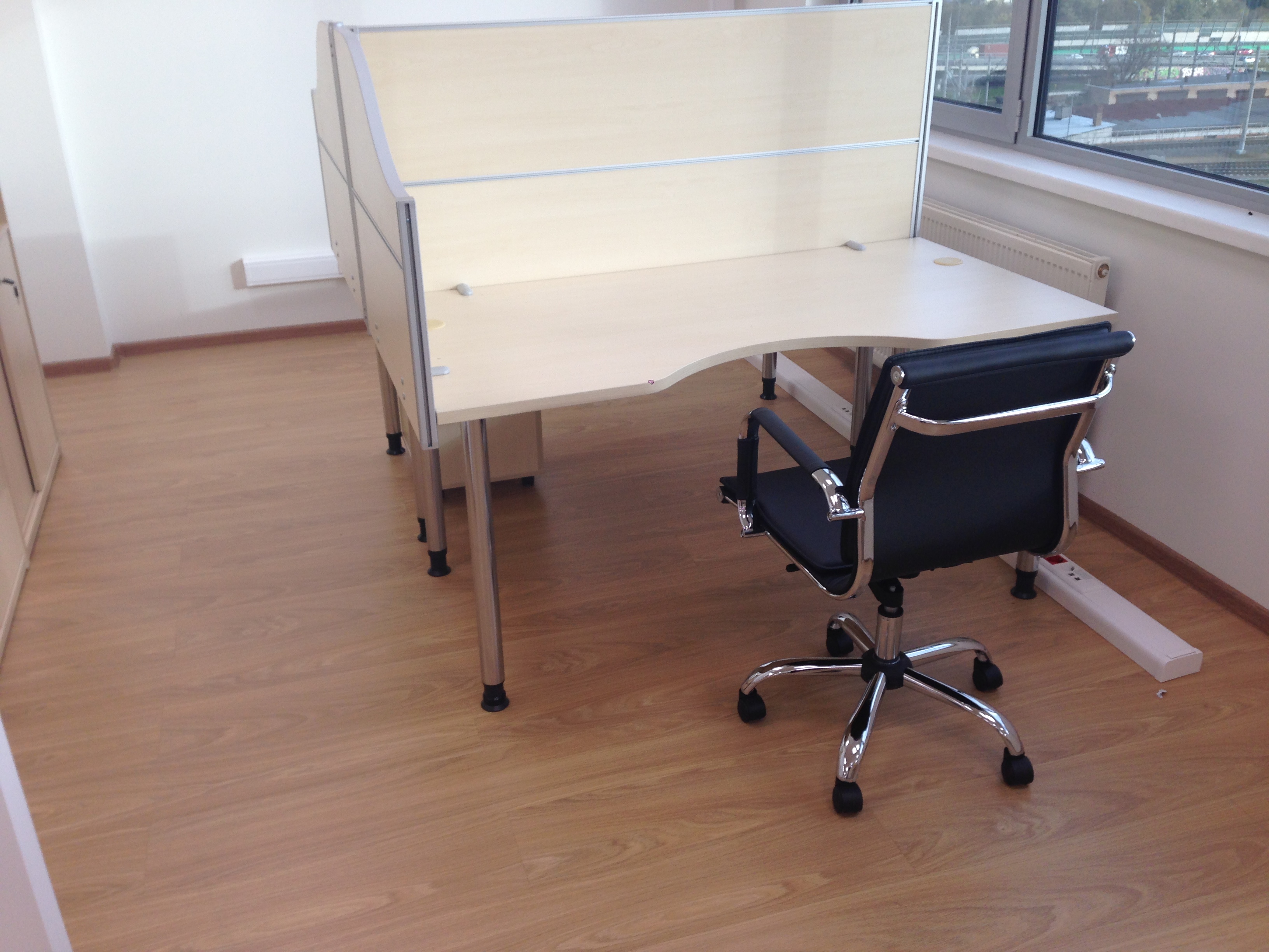 50 рабочих мест серия Periscop Orgspase. Цвет клен, опоры хром,шкафы купе для одежды,кабинет Flash выбеленный дуб.