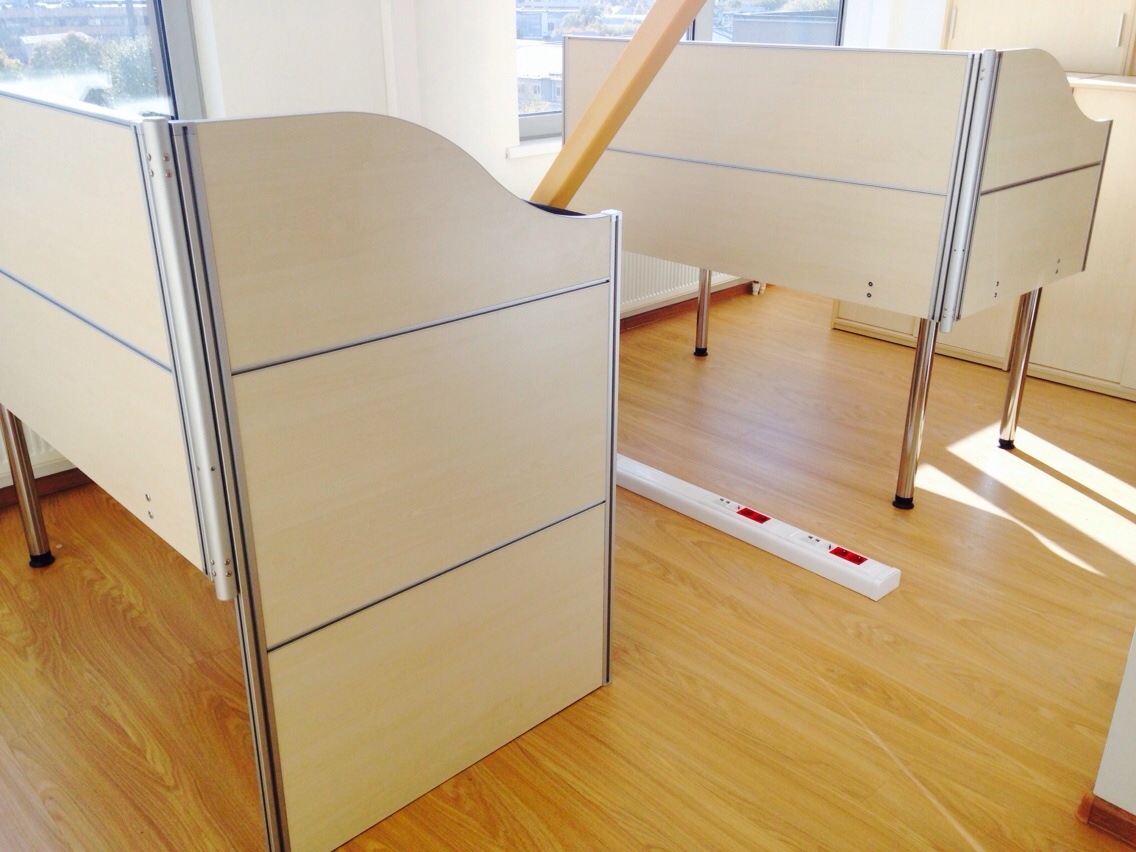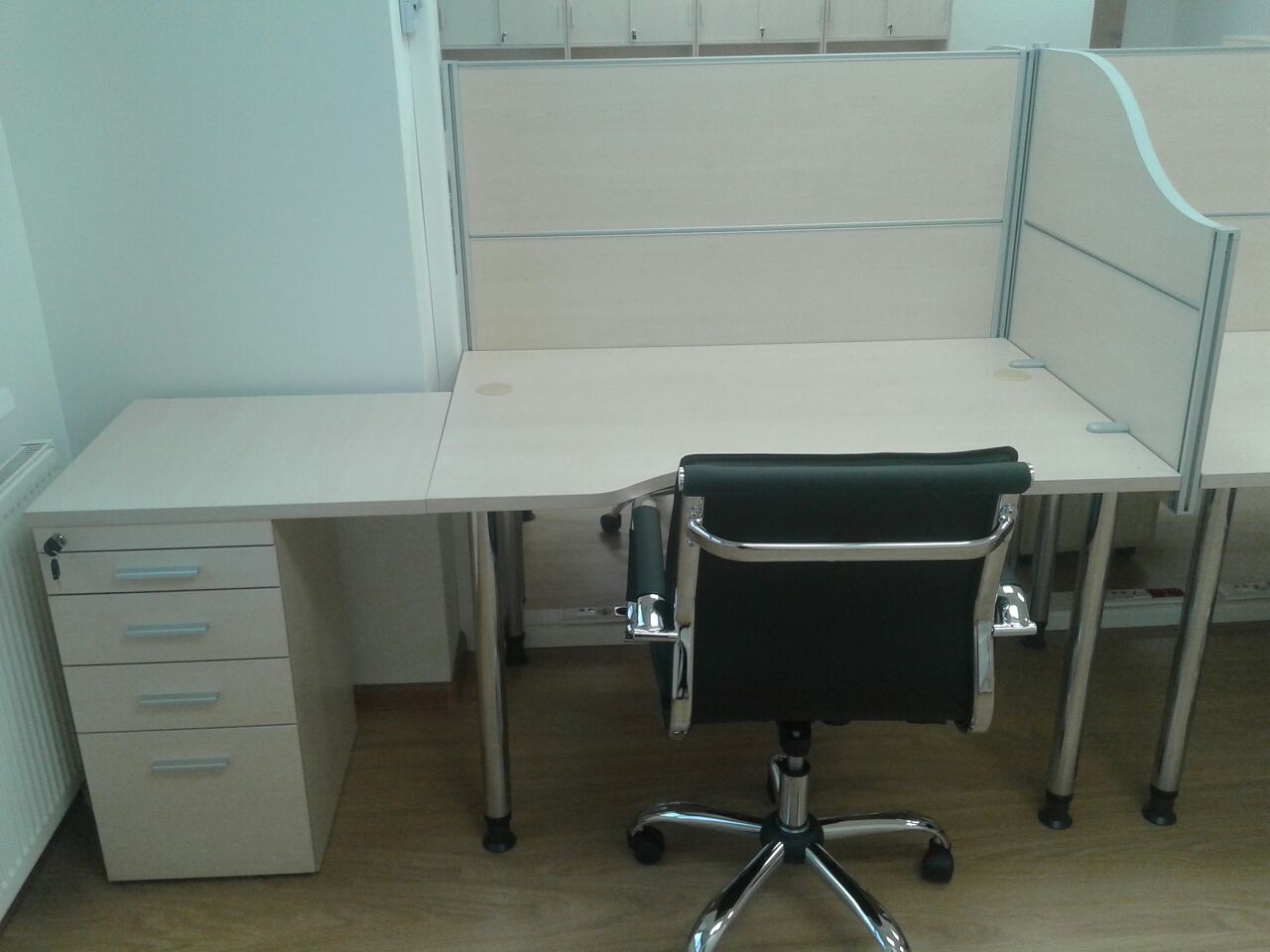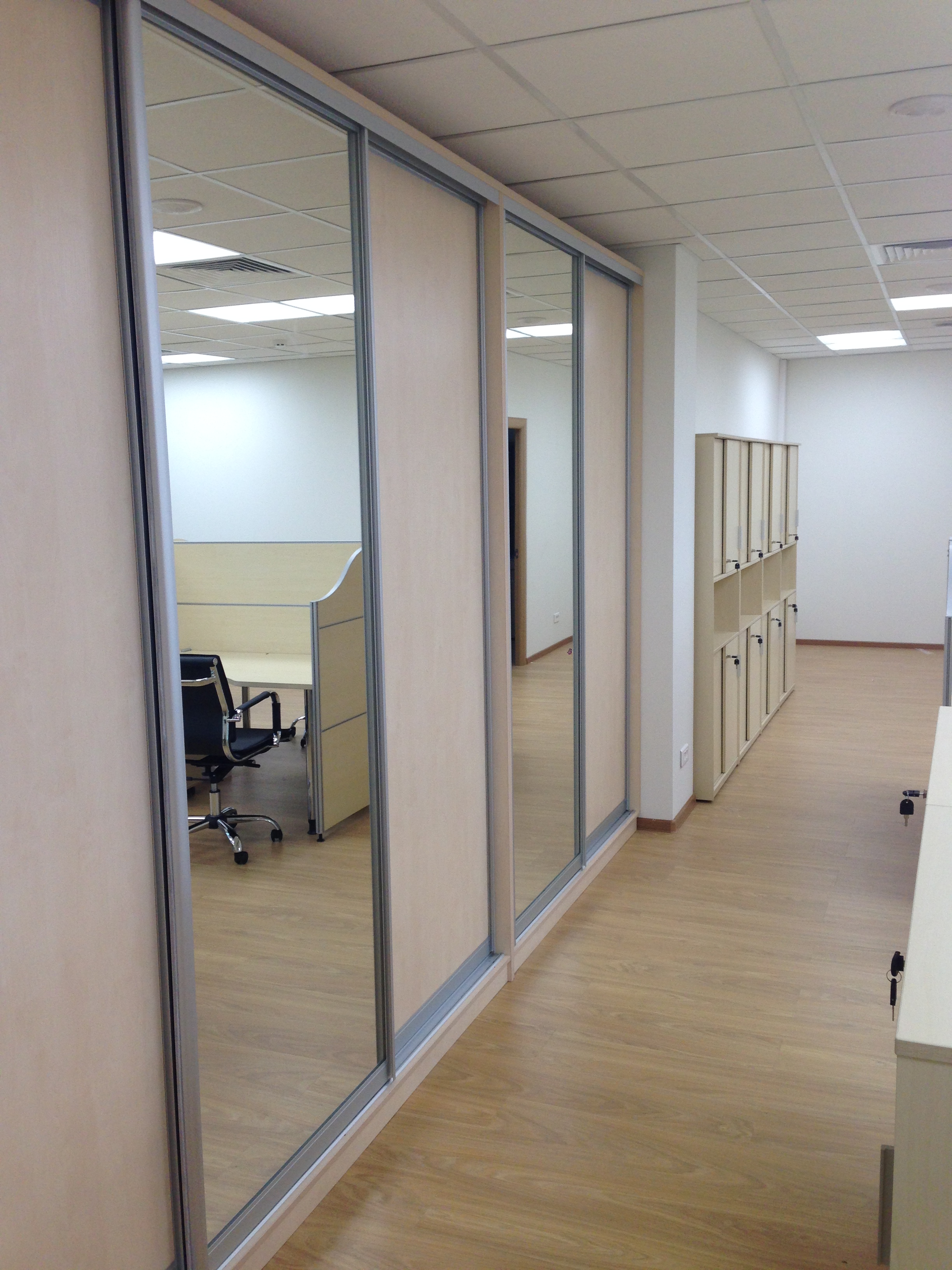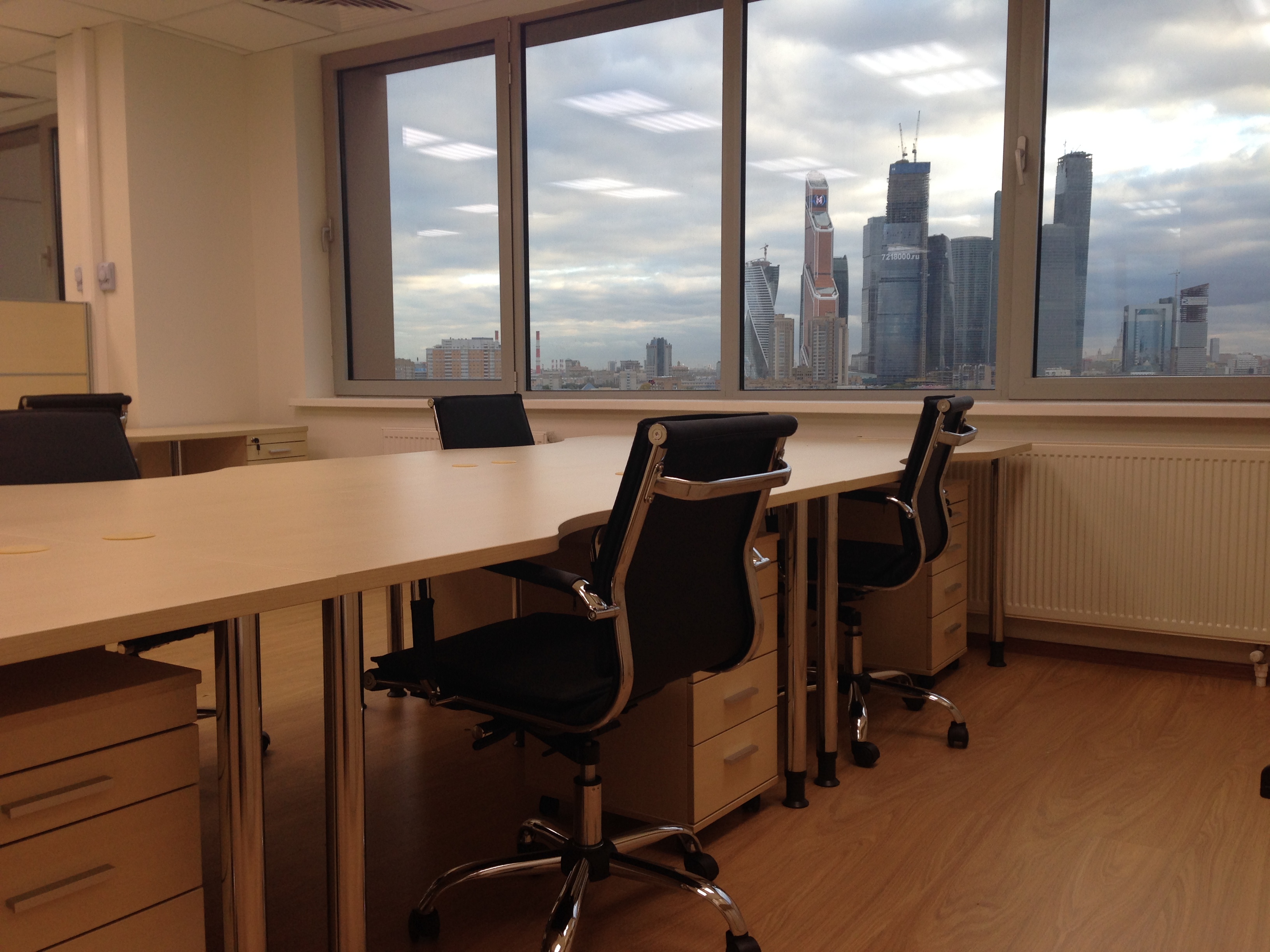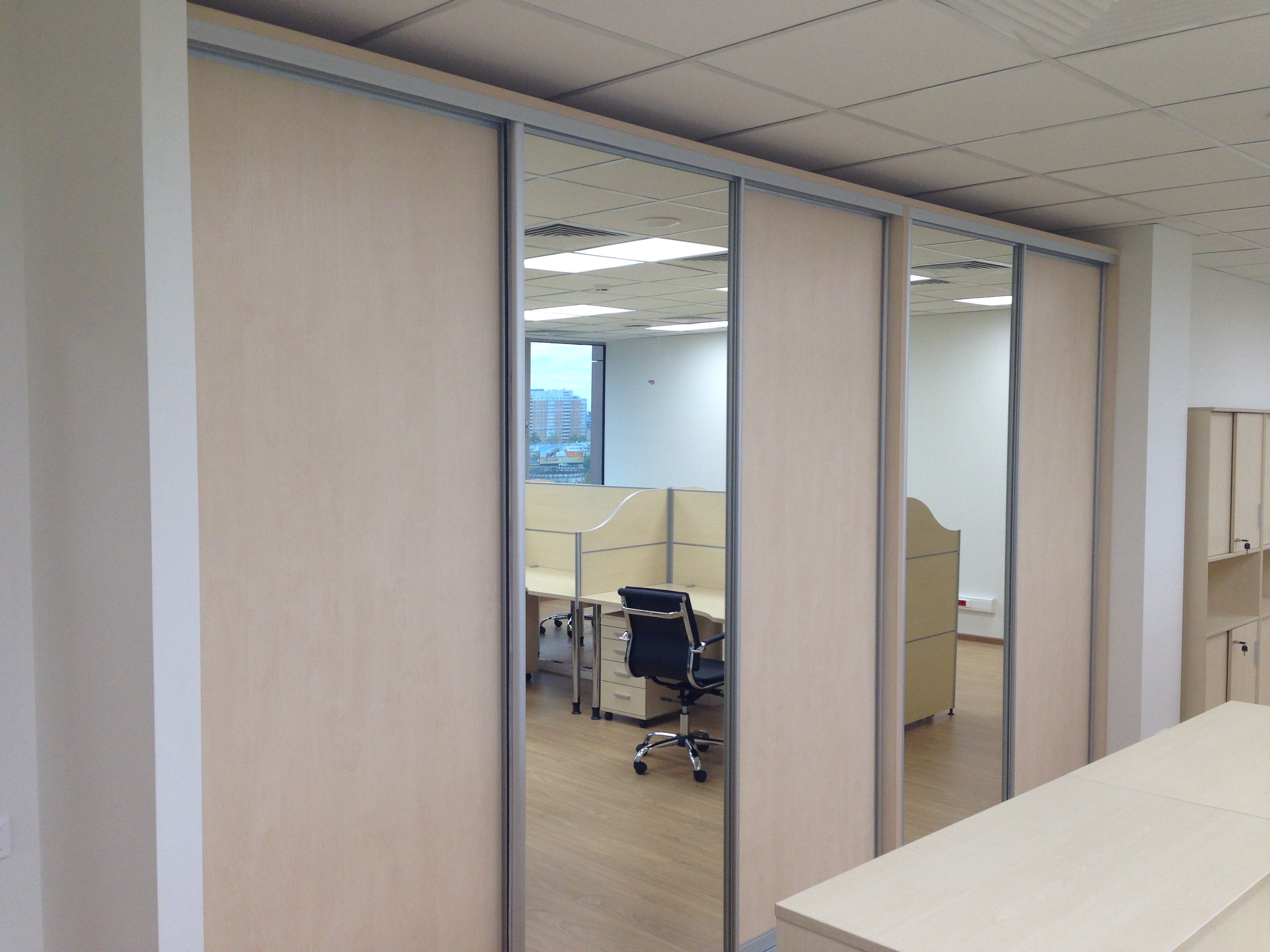 50 рабочих мест серия Periscop Orgspase. Цвет клен, опоры хром,шкафы купе для одежды,кабинет Flash выбеленный дуб.
