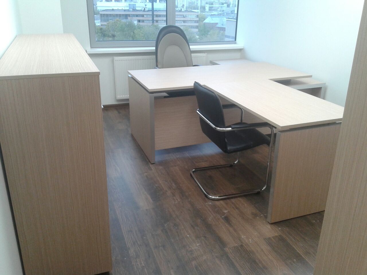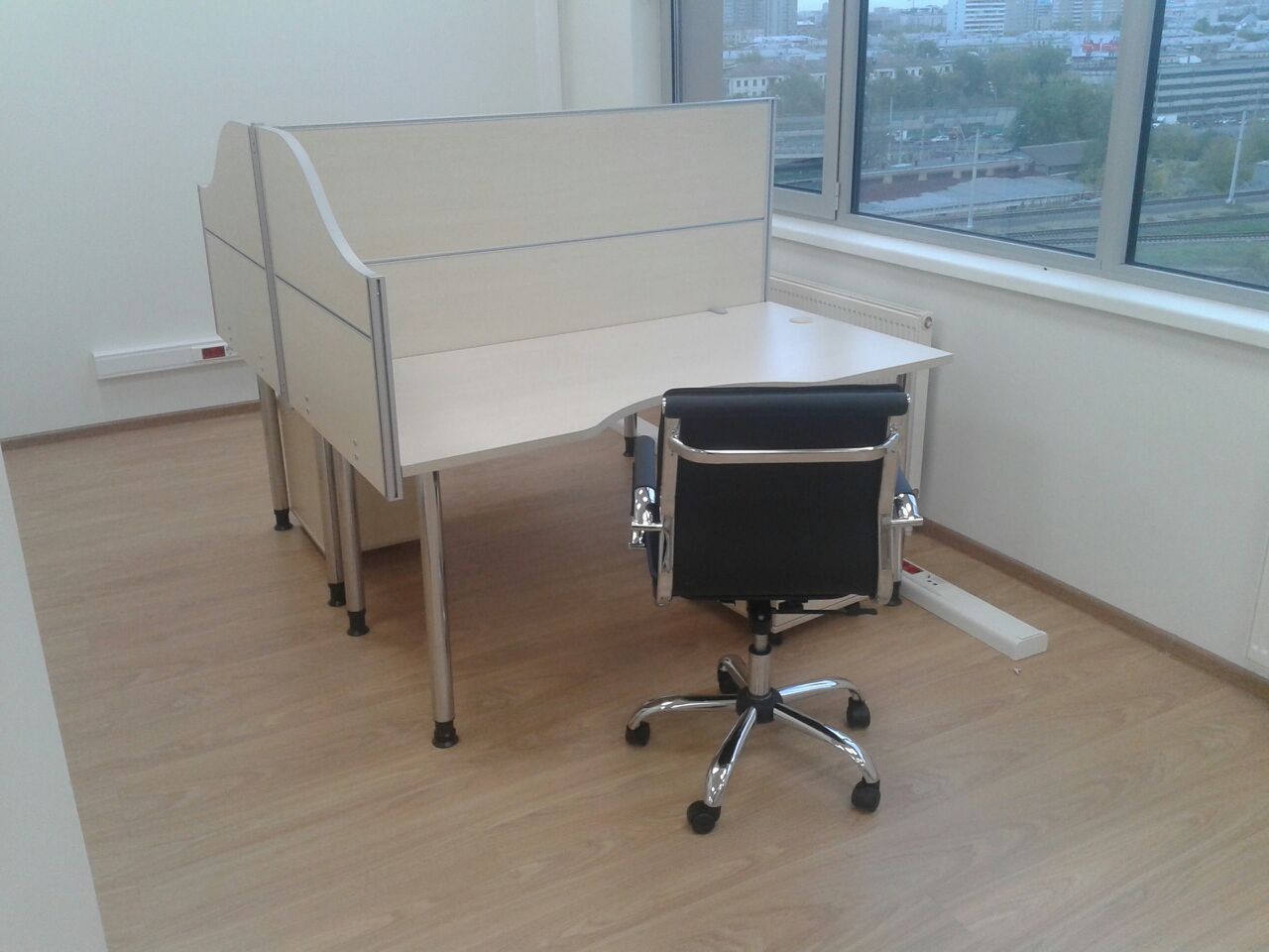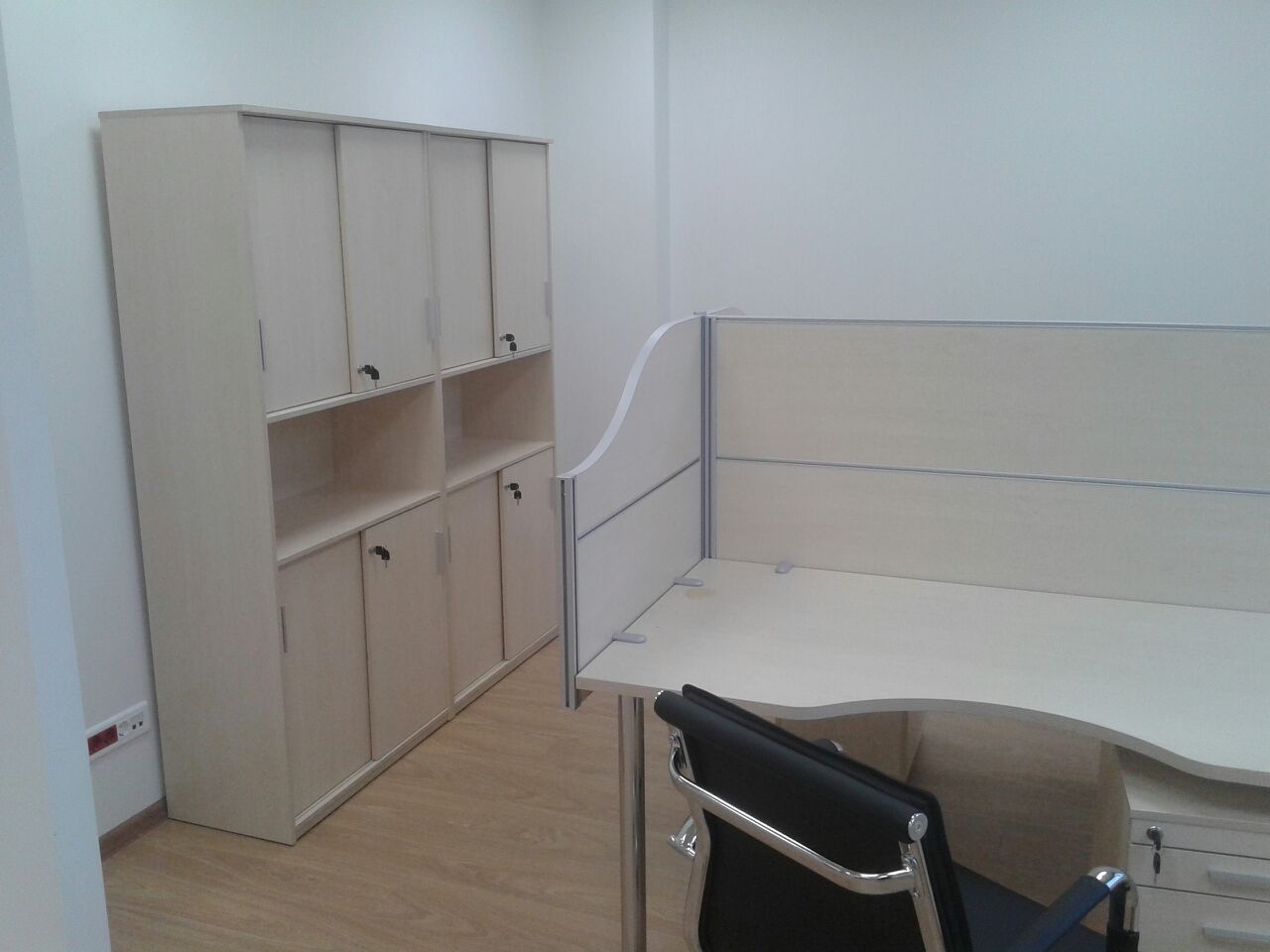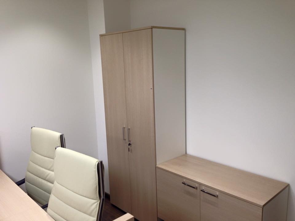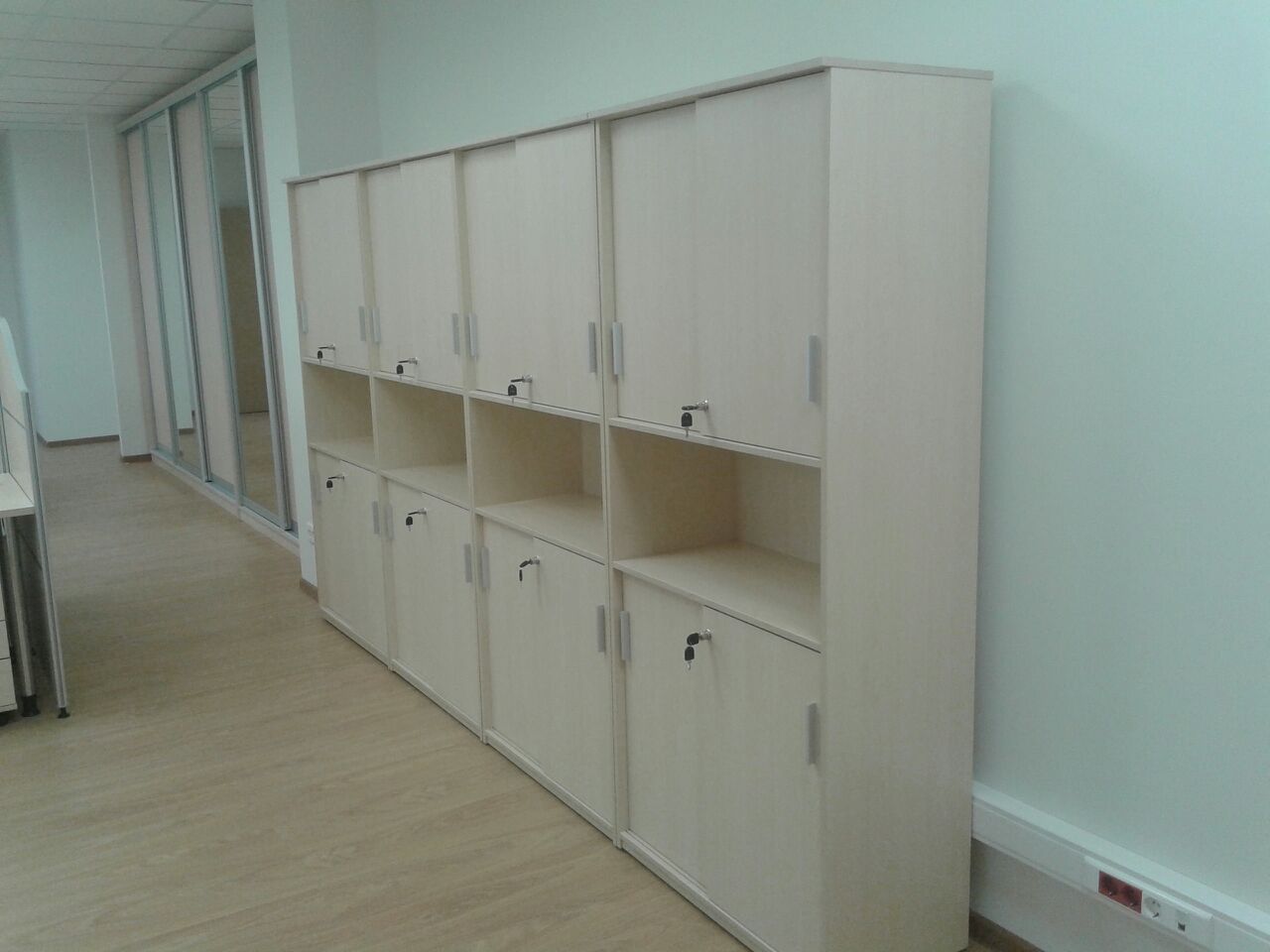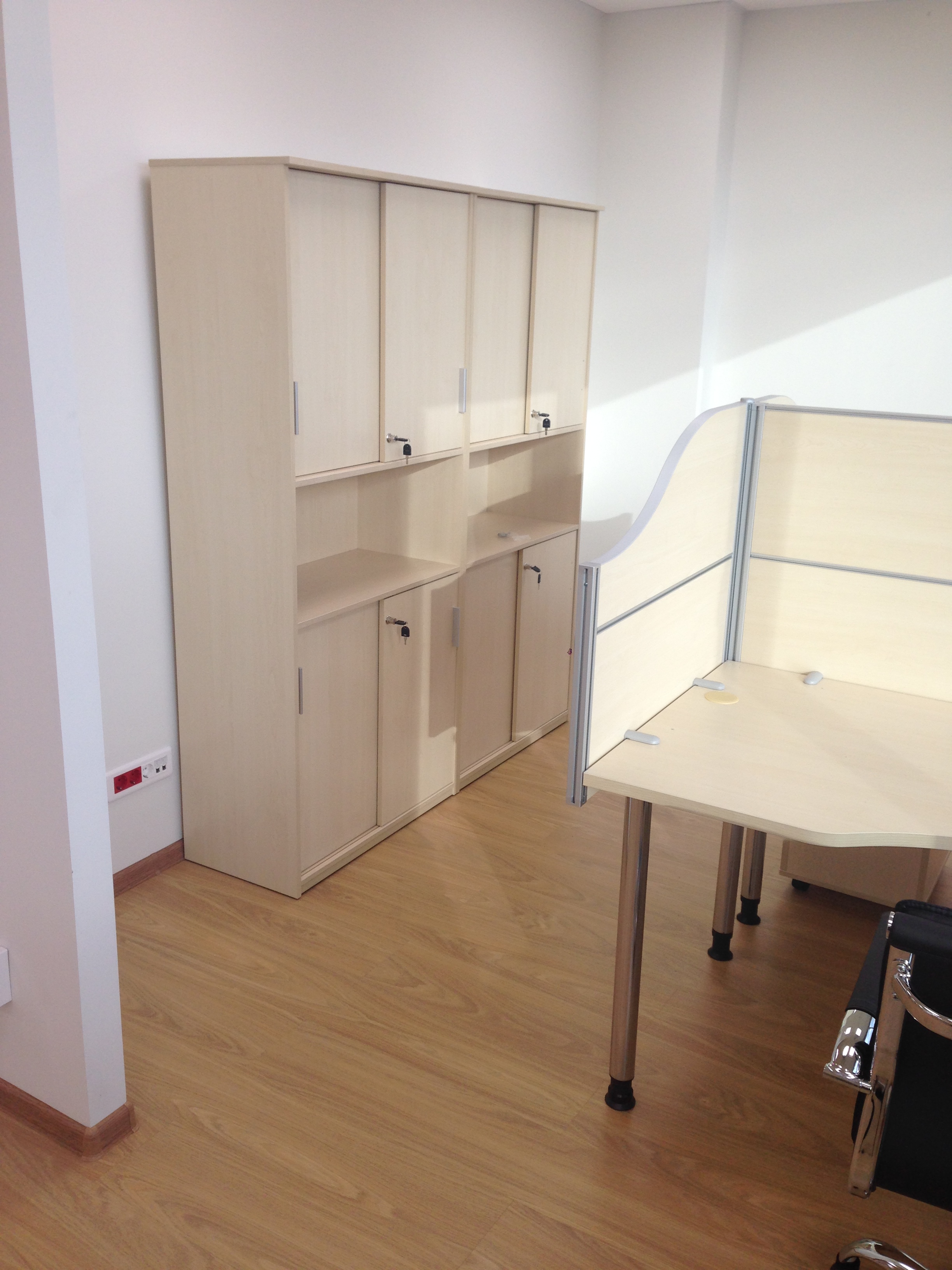 50 рабочих мест серия Periscop Orgspase. Цвет клен, опоры хром,шкафы купе для одежды,кабинет Flash выбеленный дуб.