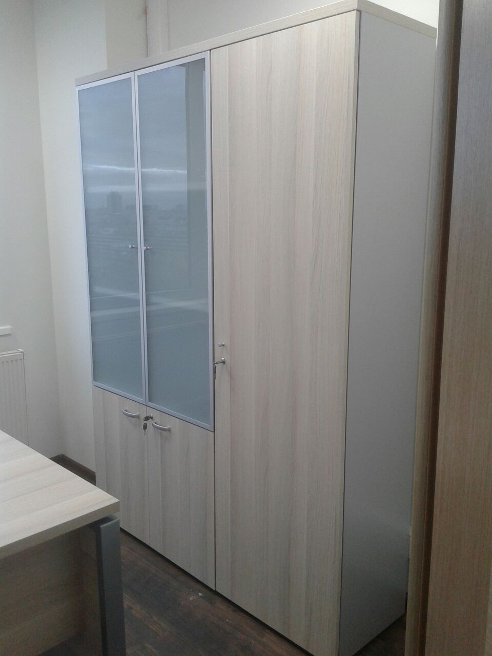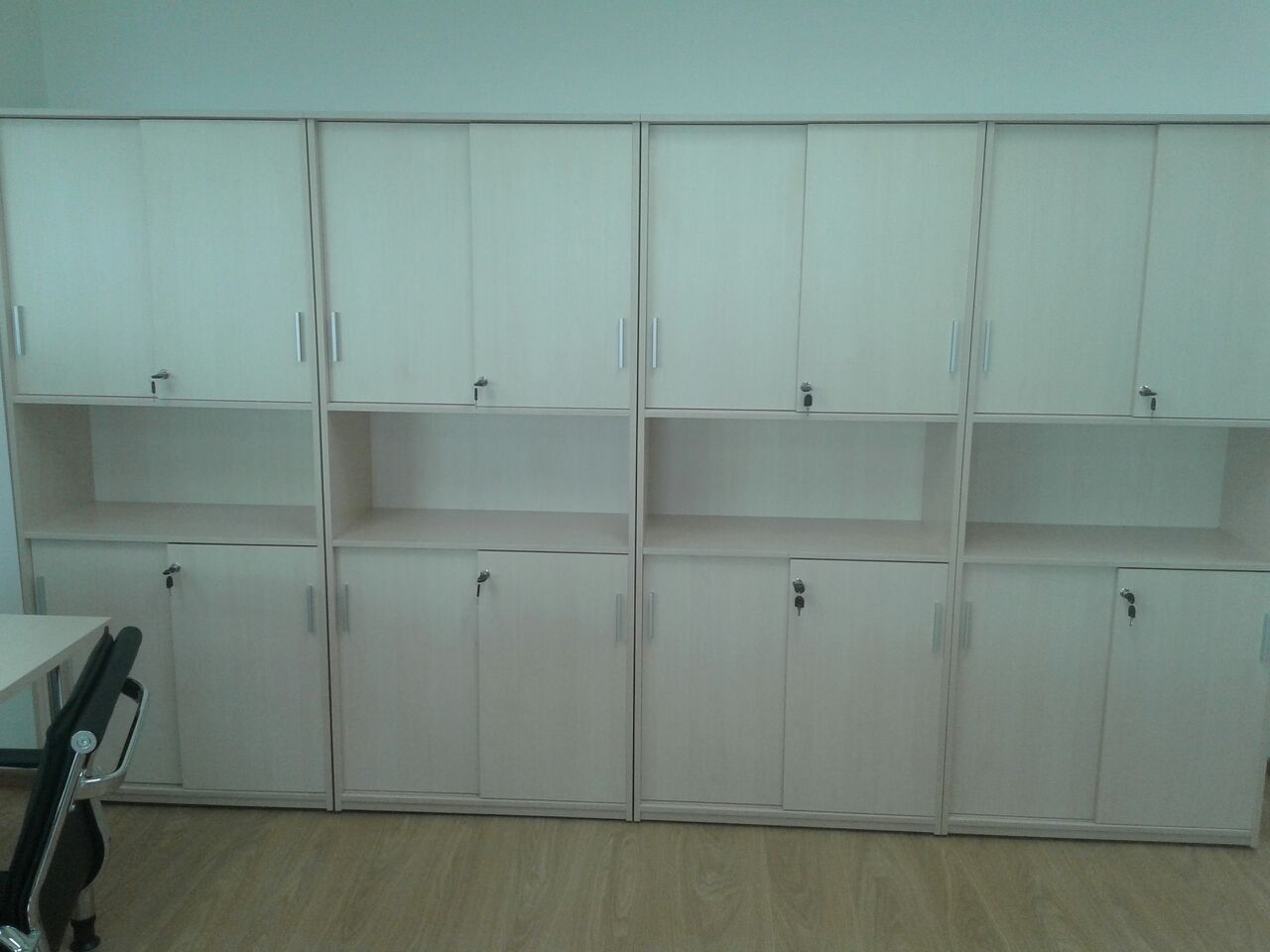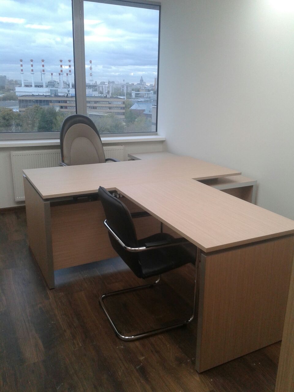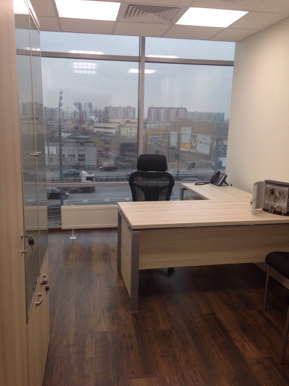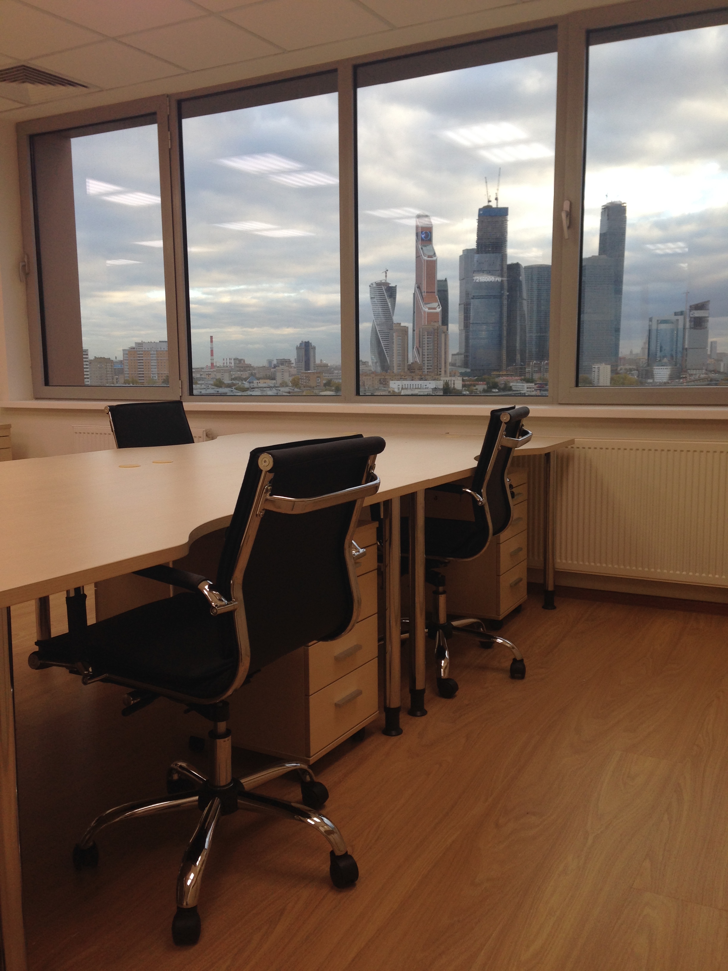 50 рабочих мест серия Periscop Orgspase. Цвет клен, опоры хром,шкафы купе для одежды,кабинет Flash выбеленный дуб.