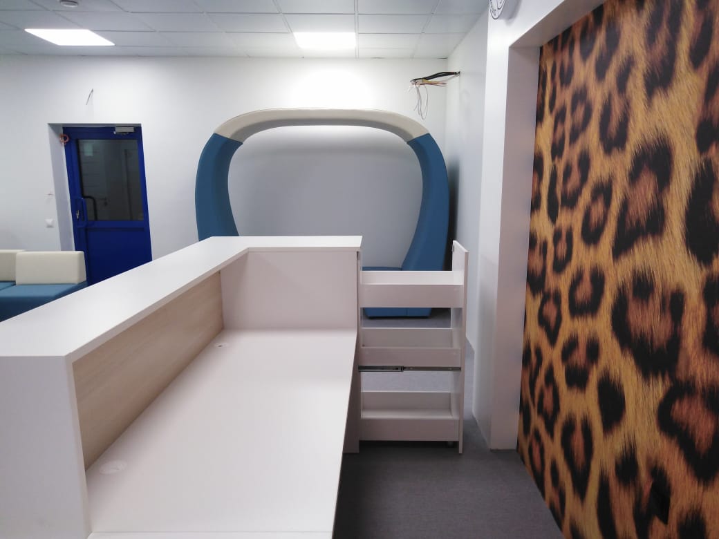 Благодаря стараниям сотрудников и дизайнеров, пушистых пациентов и их хозяев будут встречать администраторы за функциональной стойкой ресепшн. Представленная модель изготовлена с учетом современных требований. При ее изготовлении используются только высококачественные материалы. Производитель продумал каждую деталь, чтобы работники и посетители чувствовали себя комфортно. Ожидать приема специалиста домашние питомцы будут на удобных модулях, которые отличаются стильным исполнением. Материалы, из которых они изготовлены, отличаются повышенной износоустойчивостью и крепкой конструкцией.