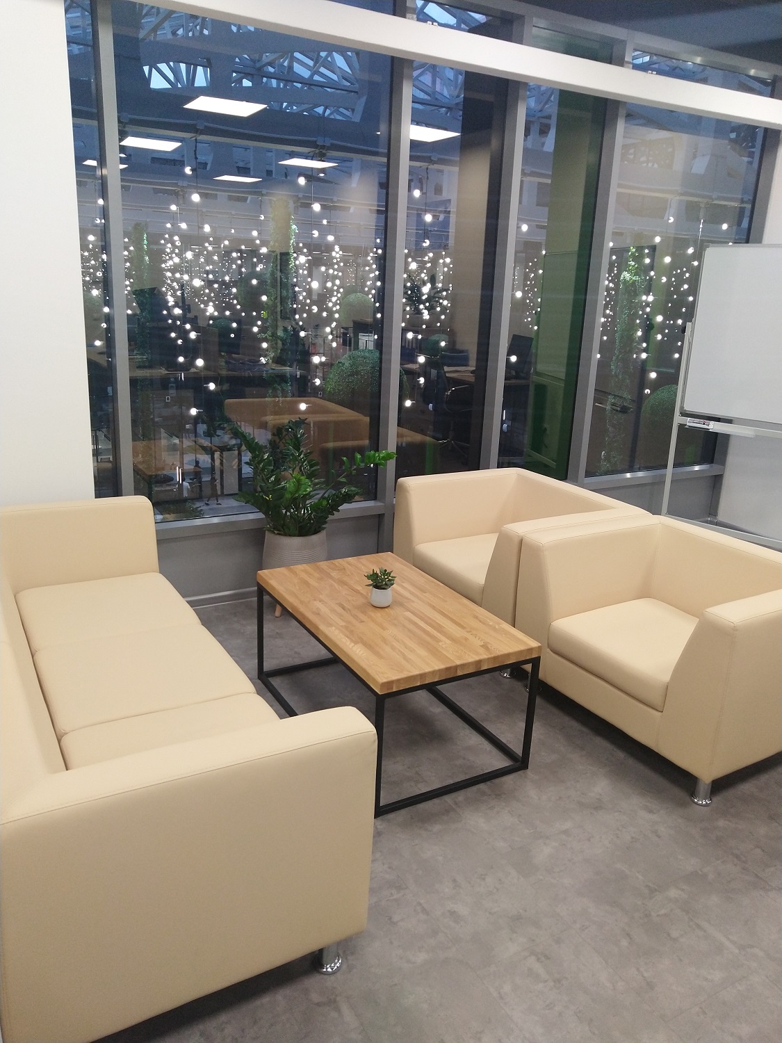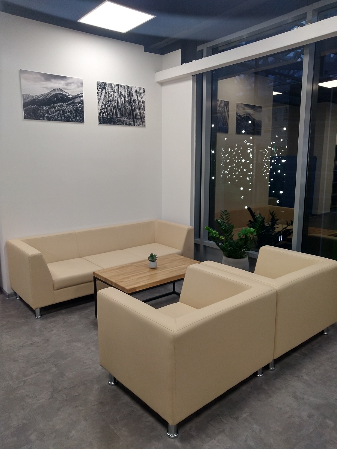 Нам также предстояло обдумать зону ожидания для посетителей и клиентов компании. Для этого мы выбрали мягкие элементы из коллекции Омега-Люкс фабрики Альфа-Мебель. В общем в офисе получилось уютно и комфортно, но стильно и элегантно.