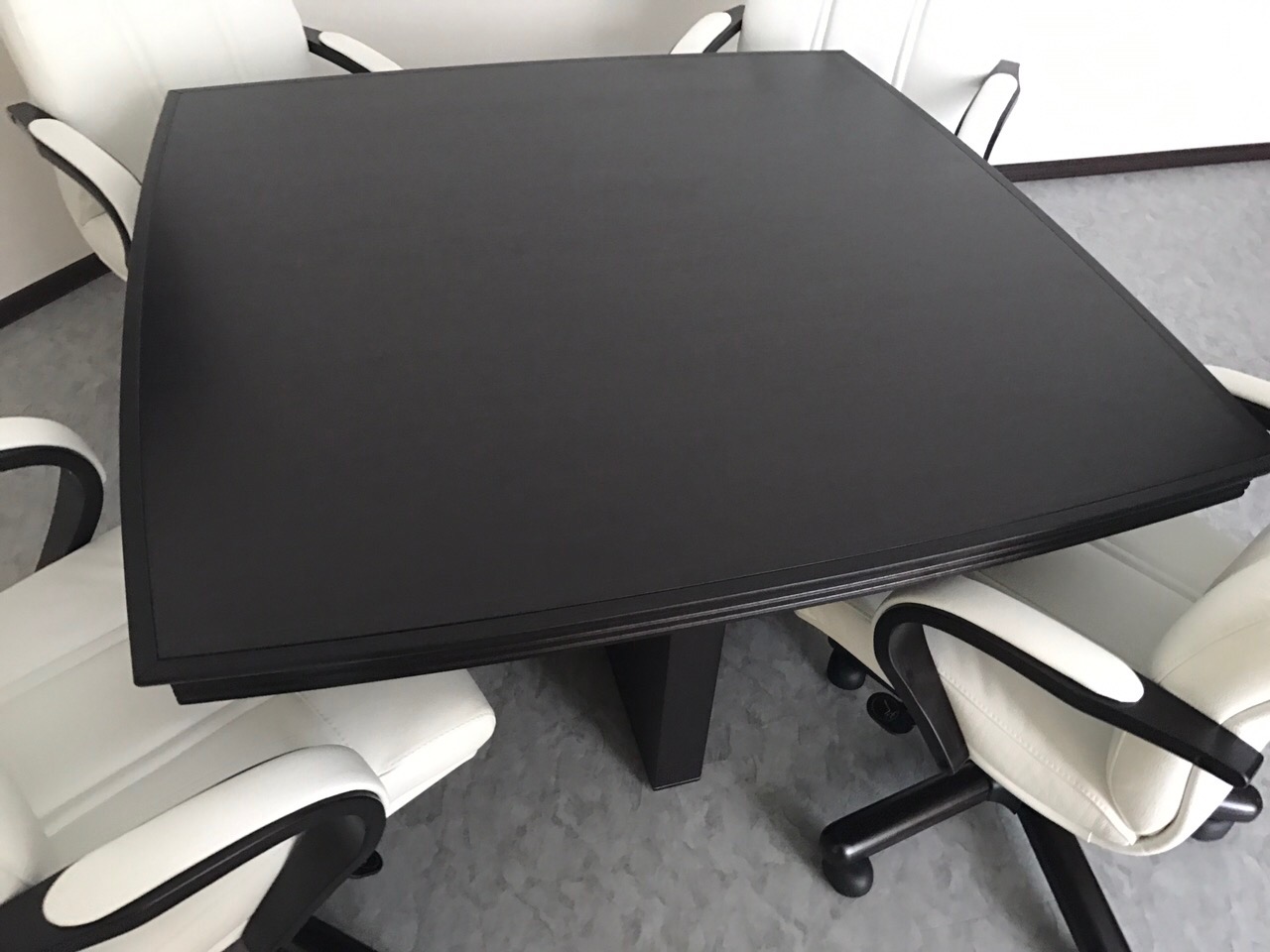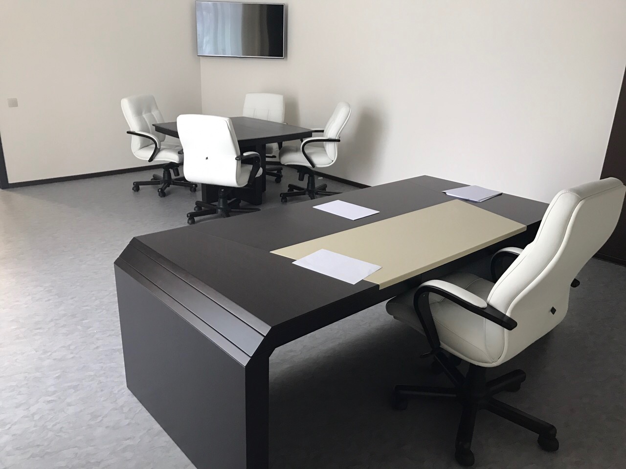 Черные столы с закругленными краями из серии Quaranta от итальянской фабрики Проффофис отлично дополняются белыми креслами. Благодаря такому контрасту даже самый простой интерьер смотрится интересно и изысканно. Полученный дизайн кабинета не оставит равнодушным ни одного руководителя.