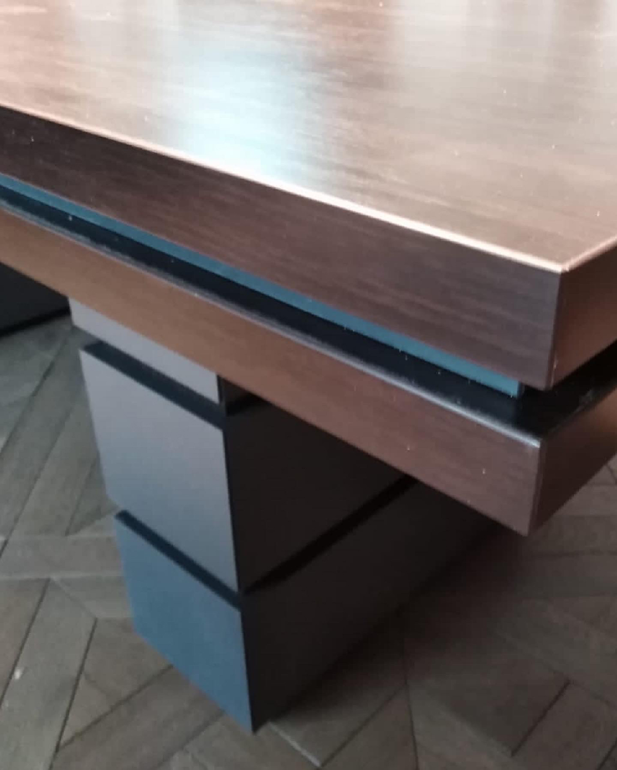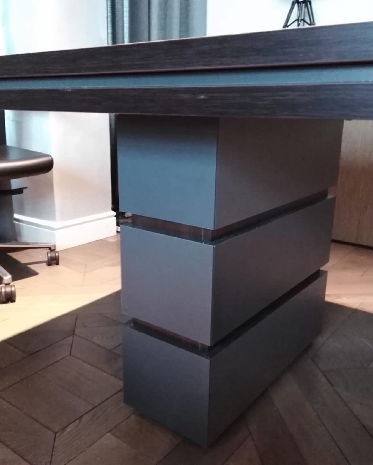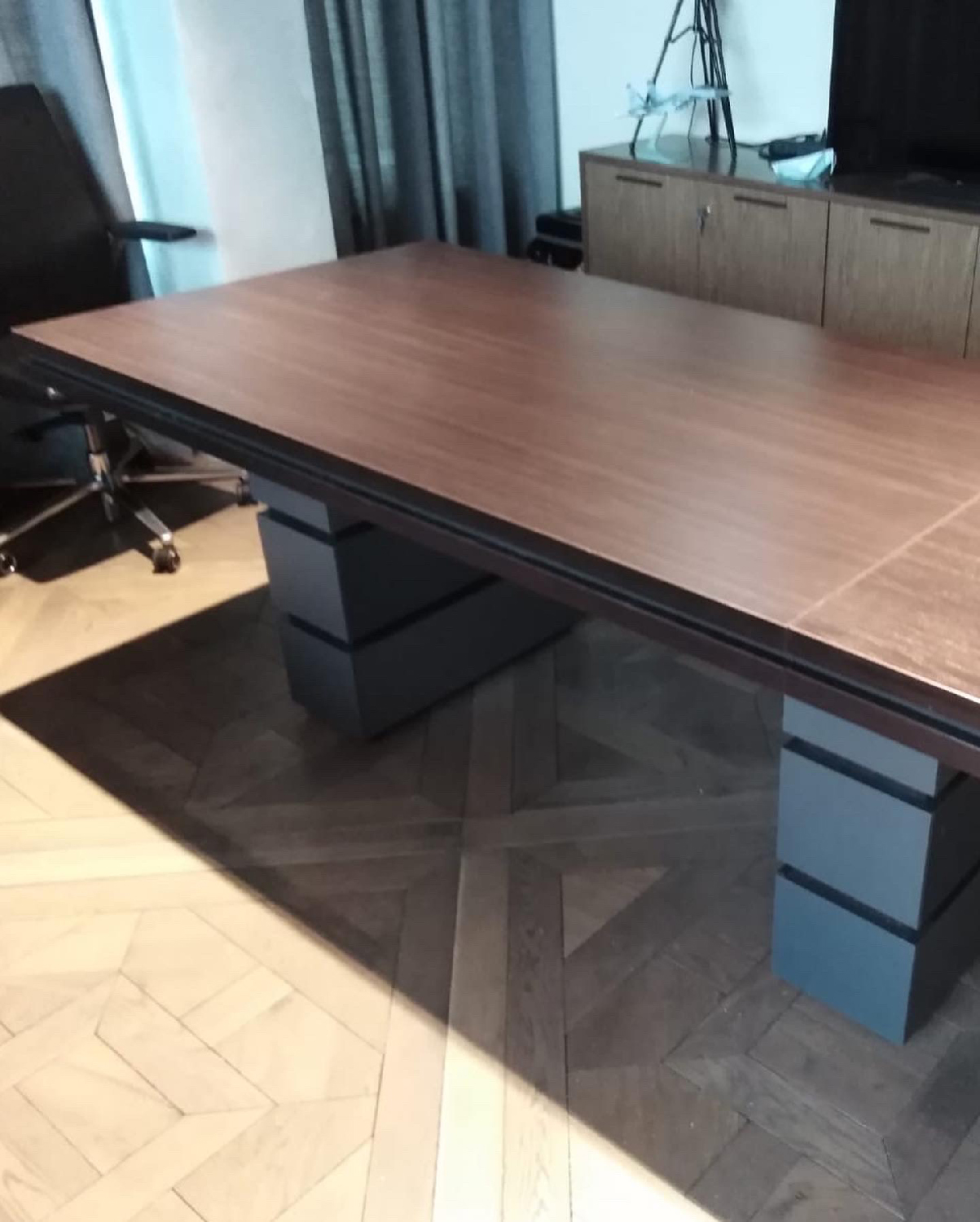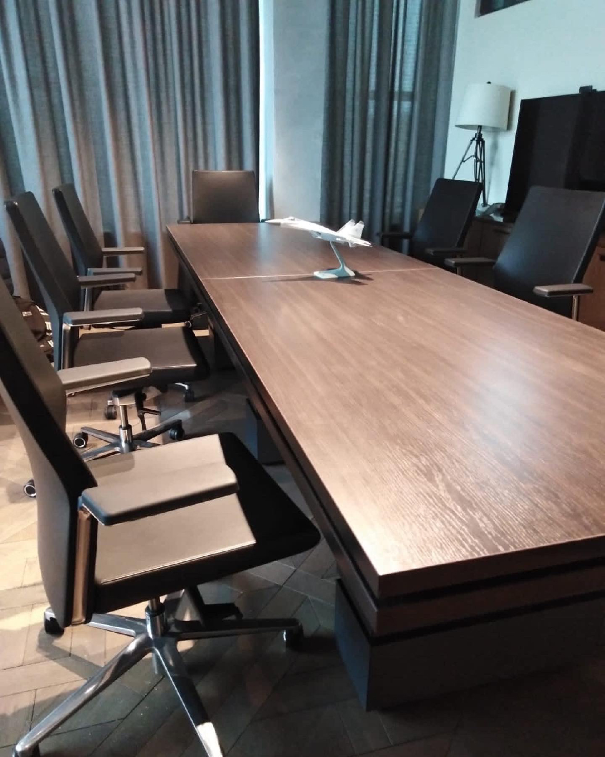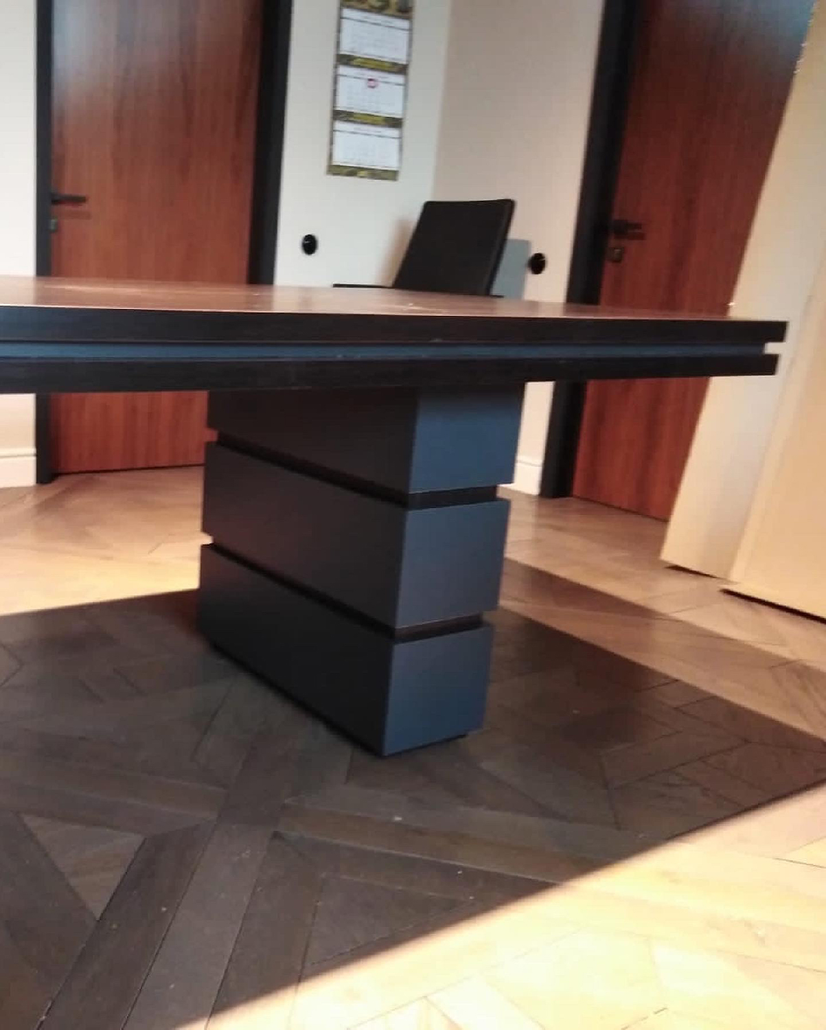Сотрудники компании «Офисная Мебель АЛЬФА-М» собрали мебель для переговорной комнаты по заказу нового клиента. Нами была осуществлена поставка стола переговоров «Проект». Данная модель имеет нестандартные размеры мебели — 3500*1000*750. Клиент выбрал насыщенный коричневый цвет венге/антрацит. Антрацитовый цвет в интерьере — настоящая загадка. Такое оформление переговорной комнаты выглядит достаточно строго и эффектно.